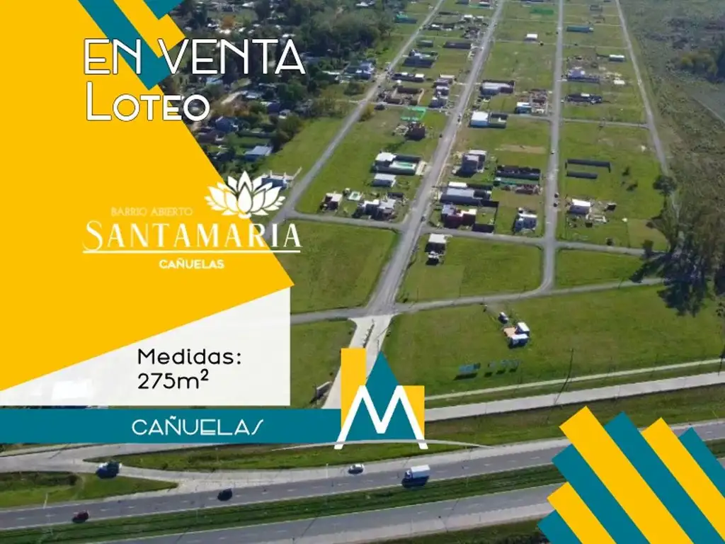 A metros del ingreso al barrio Santa Rosa, en la Localidad de Cañuelas, nace el Barrio abierto "Santa María", con mas de 400 lotes vendidos; El mismo se encuentra muy desarrollado; la mayoría destinados a casas de fin de semana y algunos con residencia permanente.-