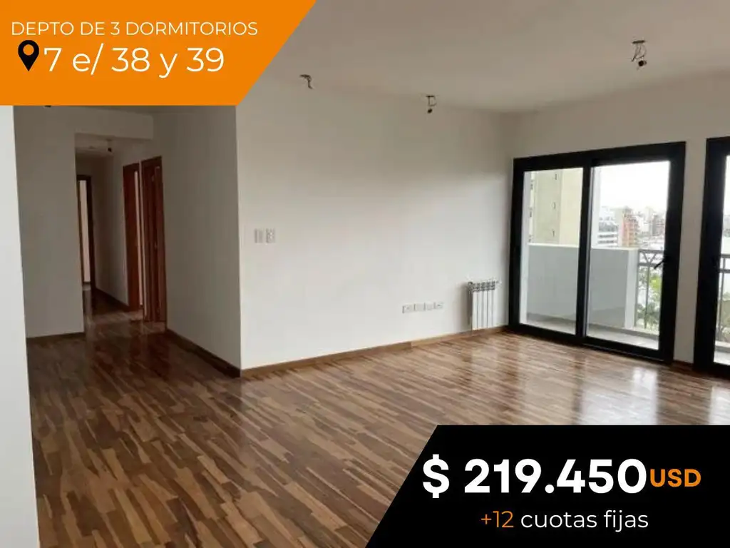 _ Departamento en venta a estrenar de 3 dormitorios ubicado sobre Avenida 7 entre 38 y 39 - La Plata- desarrollado en piso nueve con acceso por ascensor y disposición frente. El mismo cuenta con tres dormitorios con placar, el principal en suite, un baño completo, cocina en forma de "L" con muebles sobre y bajo mesada separados del living comedor con salida al balcón al frente.