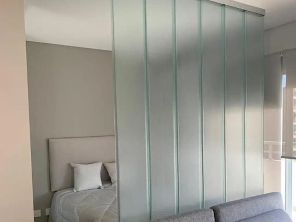 Poseen Espacio De Dormitorio Con División De Vidrio Y Espacio De Home Office.