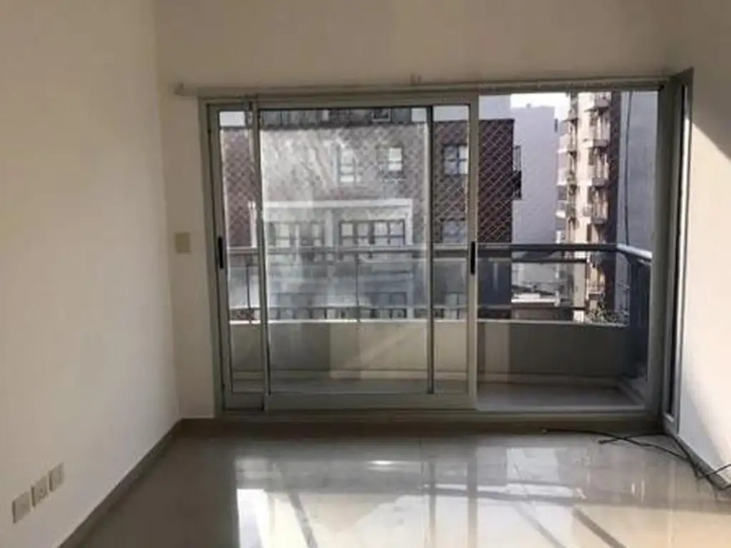 LIVING COMEDOR con piso de porcelanato y salida a balcón contrafrente con puertas corredizas .