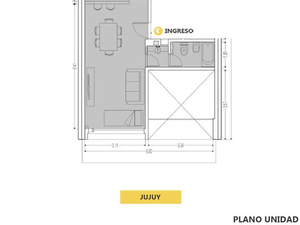 Amplio monoambiente con cocina integrada y barra desayunadora con ventanal al frente sobre calle Jujuy. Ante baño y baño completo.