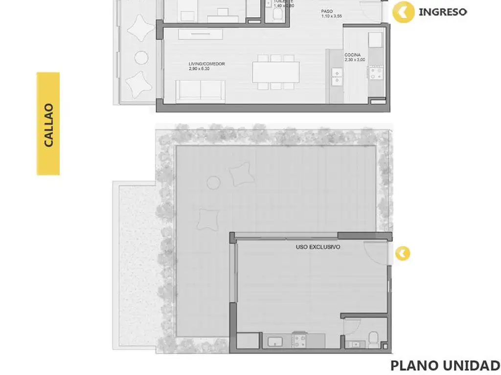 Ingreso al ambiente principal con cocina semi separada y balcón al corrido al frente. Toilette. Suite principal con vestidor y ventanal Norte. Dormitorio secundario con placard y salida al voladizo. Tercer dormitorio con ventanal al contra frente. Baño completo. Terraza de uso exclusivo en planta alta.