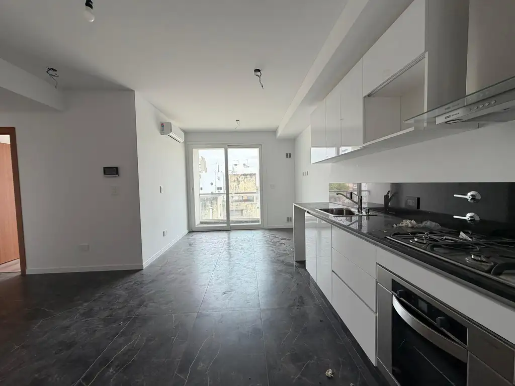 Ingreso al departamento mediante puerta ignífuga (cortafuego) hacia un luminoso living comedor con pisos de porcelanato negro en placas de 0,60 x 1,20.