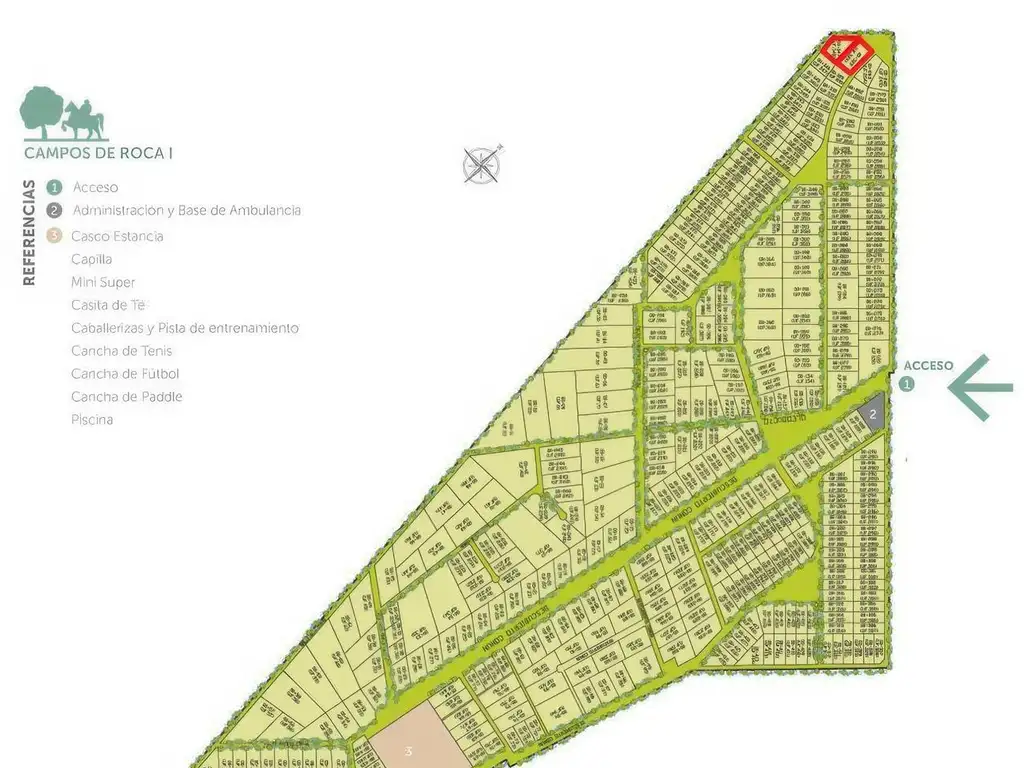_ Terrenos en venta ubicados en el barrio cerrado Campos de Roca ubicado sobre la Ruta 2 (Coronel Brandsen, Buenos Aires). Con disposición interna y orientación norte.