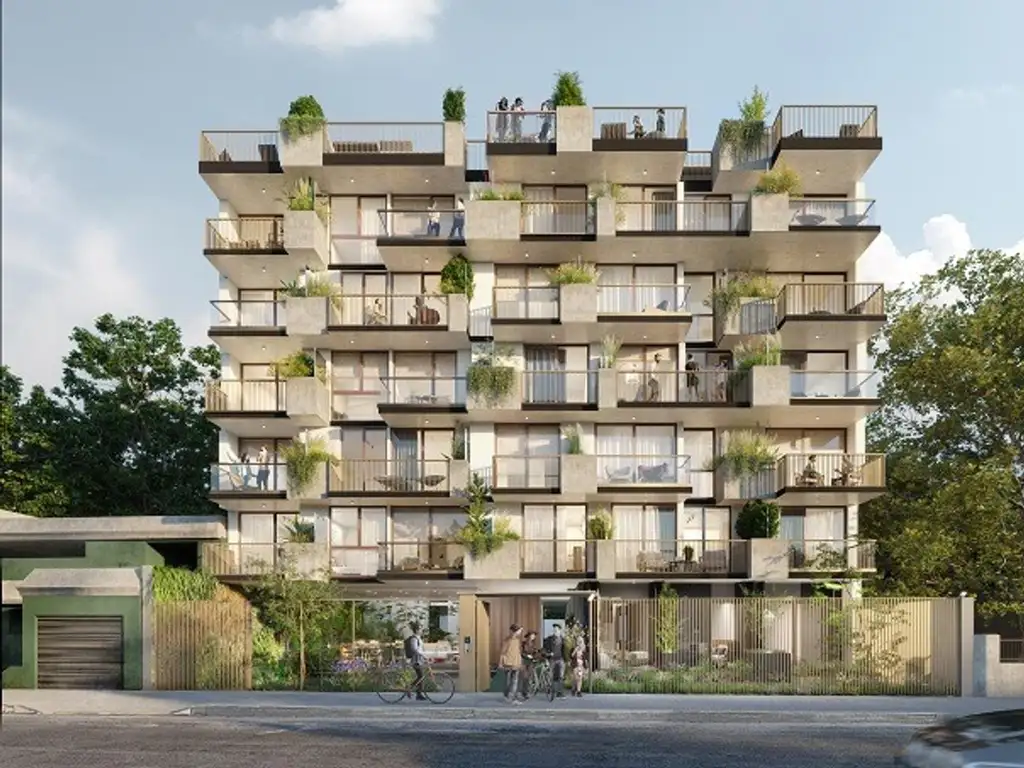 El hall de ingreso vidriado, vinculado al jardín frontal, posee un área de cowork interior y un conjunto de amenities se despliegan en el último nivel. Con aéreas comunes y de servicios para el disfrute: parrilleros semi cubiertos, laundry, tender, áreas de co-living interior con terrazas exteriores y solárium,