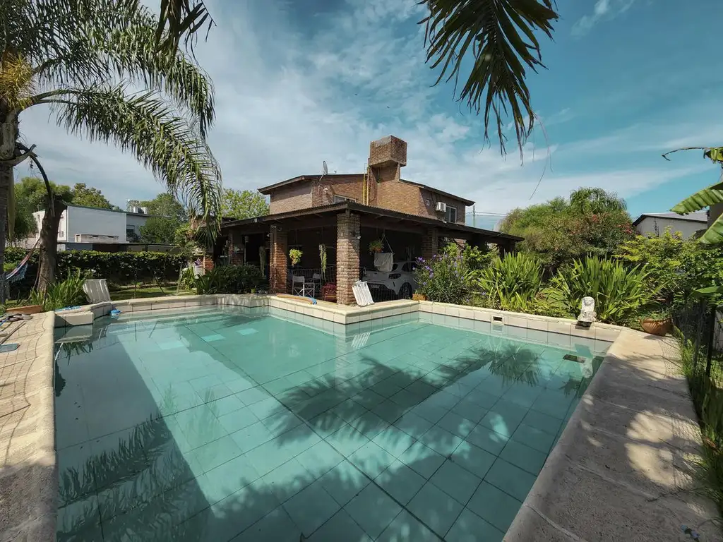 Casa distribuida en dos plantas, con amplio jardín y pileta, 3 dormitorios y un comodín o cuarto dormitorio, 3 baños y cocina semi integrada. Ingreso a la propiedad desde la calle a un pequeño jardín que da paso a la puerta principal, desde la misma se accede a un hall de ingreso integrado a un amplio living con ventanales de piso a techo con vista al jardín que brindan mucha luminosidad y ventilación. Desde el mismo se ingresa a un recibidor que da acceso a un baño completo, un comodín (que puede ser utilizado como dormitorio de servicio, escritorio o despensa) y al comedor que se integra a una amplia cocina totalmente equipada con alacenas, bajo mesada, bacha doble de acero inoxidable con grifería mono comando, cocina de tipo industrial, extractor, espacio técnico para microondas y heladera, que cuenta con iluminación y ventilación natural. Escalera a planta alta a un íntimo con gran distribuidor apto para escritorio, tres dormitorios, dos al frente, uno de ellos con balcón y el otro al contrafrente con acceso a un gran balcón terraza de uso exclusivo, baño completo con ducha. En el exterior encontramos una hermosa galería cubierta en forma de L, con capacidad para guardar tres vehículos, espacio de quincho con parrillero y un baño completo. Jardín totalmente forestado con amplia pileta equipada con bomba y filtro en perfecto funcionamiento. Ingreso vehicular con portón automatizado. Sistema de vigilancia por cámaras en el exterior y alarma colocada en el interior de la propiedad. Climatización por calefactores (4 equipos instalados) y 4 equipos de aire acondicionado (colocados en el comedor y en dormitorios). Pisos de cerámico en todos los ambientes exceptuando el living que cuenta con pisos de madera y el dormitorio principal que posee flotante, aberturas exteriores de aluminio y agua caliente por calefón. El techo de planta baja es de hormigón con sistema de losa hueca y el de segunda planta es de chapa a dos aguas con revestimiento en madera. Tanque de agua en altura y perforación propia para el uso de la pileta.