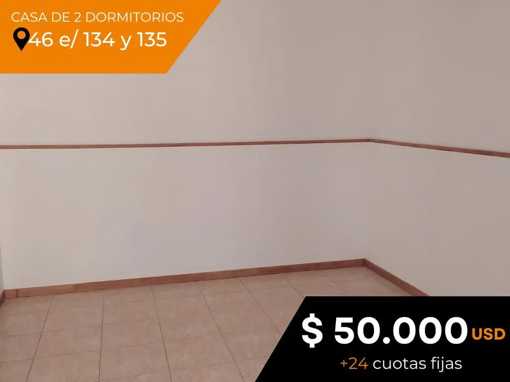 _ Casa de dos dormitorios en venta ubicada sobre calle 46 entre 134 y 135 (San Carlos, La Plata, Buenos Aires). Desarrollada en una planta, con disposición interna y orientación este, con acceso mediante un pasillo Posee cocina independiente equipada con muebles bajo y sobre mesada, lavadero, living comedor, dos dormitorios y un baño completo. Cuenta con un patio equipado con parrilla.