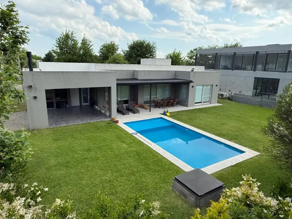 Ubicada en uno de los mejores sectores del barrio, sobre un lote central de 1.000 mts.2, sobre un cul de sac, de baja circulacion. La vivienda de estilo y diseño moderno, se desarrolla en una planta. Distribuida en dos alas, por un lado sector de servicio, sector central con ambiente principal integrado y sector reservado para los dormitorios. Consta de hall de acceso, living-comedor con cocina integrada con isla desayunadora, todo con vista a la galeria; zona de servicio con lavadero, dependencia y baño completo tambien para uso de la pileta; area reservada: dormitorio principal con vestidor y baño en suite y dos domitorios con placard embutido mas con baño completo.