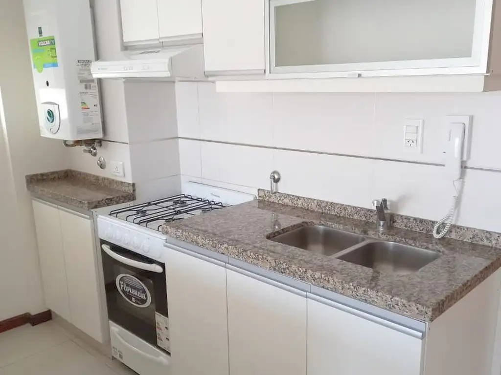 Cocina semi integrada totalmente equipada y dividida con una barra desayunador, mesada granito, artefacto de cocina instalado, calefón.