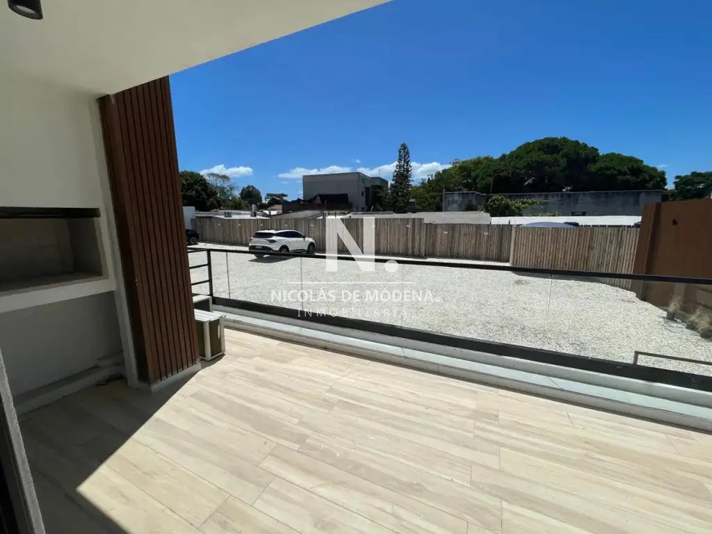 Living-comedor con cocina integrada y acceso a terraza al frente con parrillero.