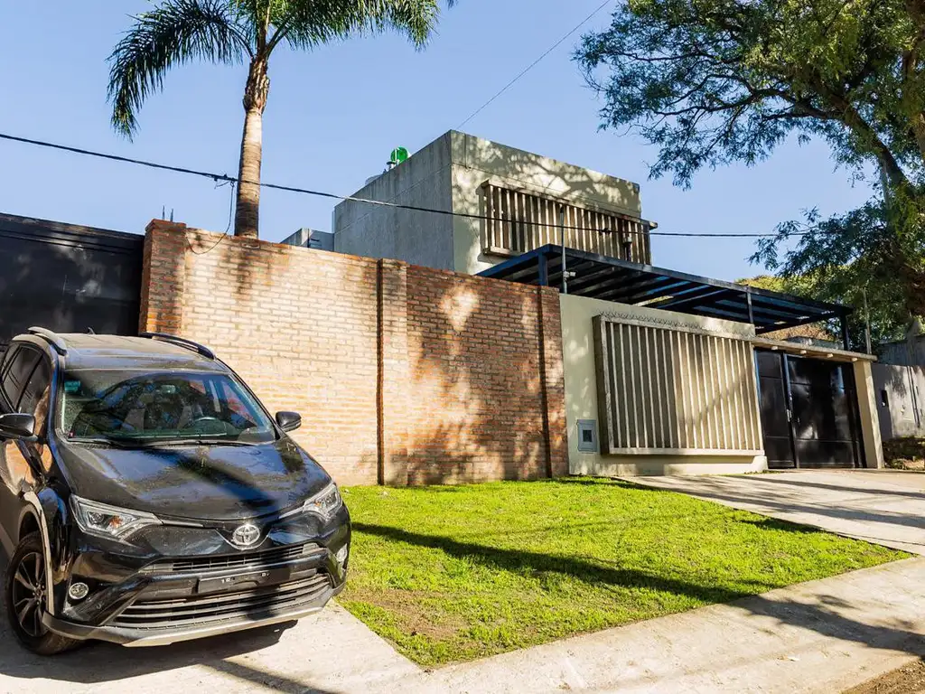 PB: living comedor y cocina integrados en un gran ambiente muy luminoso con vista al parque, toilette, lugar de guardado debajo de la escalera, jardín parquizado, pileta climatizada, parrilla, lavadero, baulera y garage pasante para tres autos.