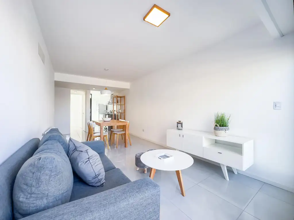 Caracteristicas: ingreso a living-comedor amplio con pisos de porcelanato, salida a balcon-terraza con espacio técnico (oculto para mayor estética) para lavarropas y para mesa con sillas. Cocina semi-integrada con muebles bajo mesada y alacenas. Baño completo con ducha. Dormitorio con pisos de porcelanato, placard y salida a balcón.
