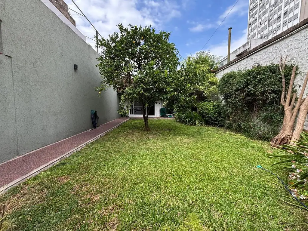 Patio ( 7 x 12 mts) parte verde y parte material, baño tipo toilette y al fondo un quincho de 38 m2, provisto de parrillero, horno a leña, mesada con muebles bajo mesada, hogar a leña, etc.
