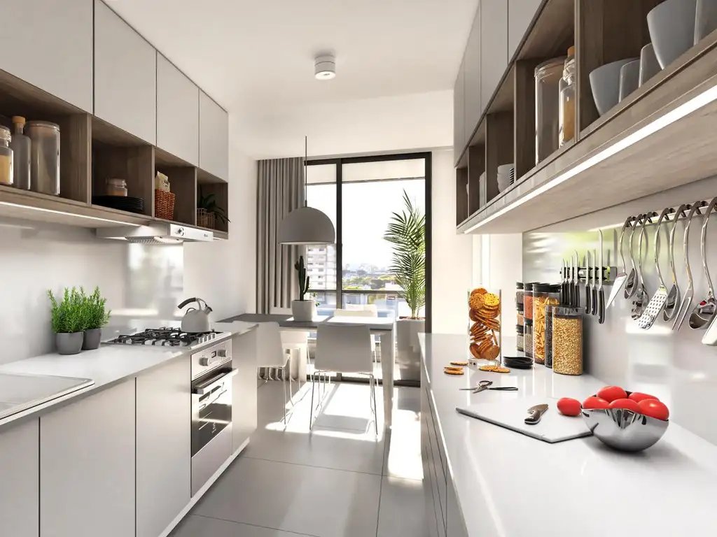 - Cocinas con muebles completos, mesada de granito o similar, grifería mono comando, horno y anafe eléctrico de 4 hornallas en unidades 2,3 y 4 ambientes, anafe eléctrico de 2 hornallas en unidades de un ambiente