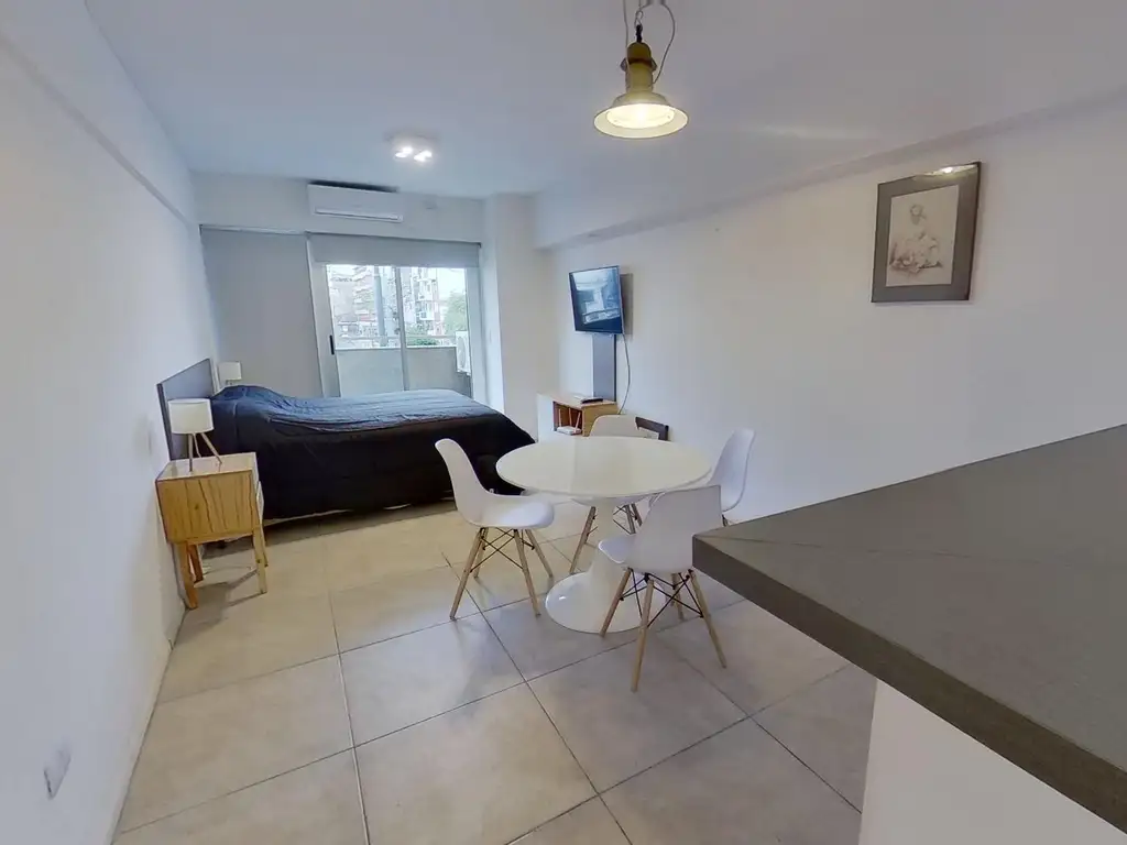 Amplio y luminoso ambiente con cocina integrada , barra para desayunar, gran ventanal con vista al balcón , aire acondicionado, pisos de porcelanato, calefacción por loza radiante, muebles de cocina y grifería de calidad , baño completo con bañera.
