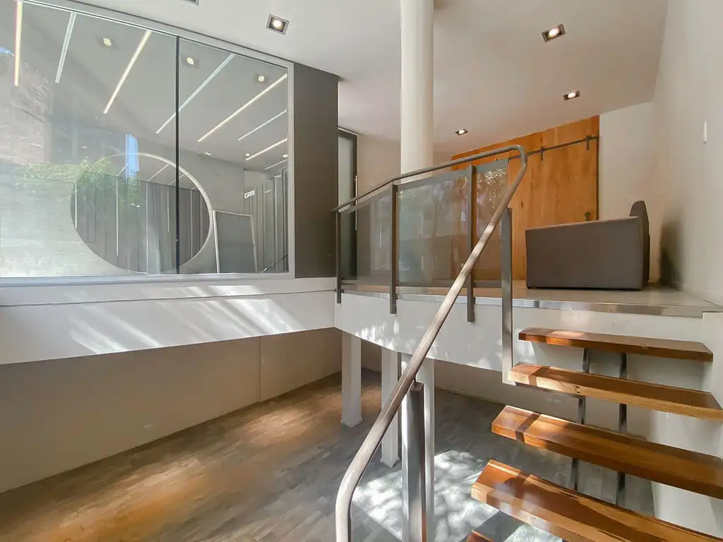 Oficina al frente con ingreso independiente, la misma cuenta con recepción, cocina tipo kitchenette y baño. Sala principal amplia divisible en subsuelo, ideal para puestos operativos. Excelente diseño y terminaciones con pisos de porcelanato, luminaria incorporada, preinstalación para A/A, escalera con escalones de madera.