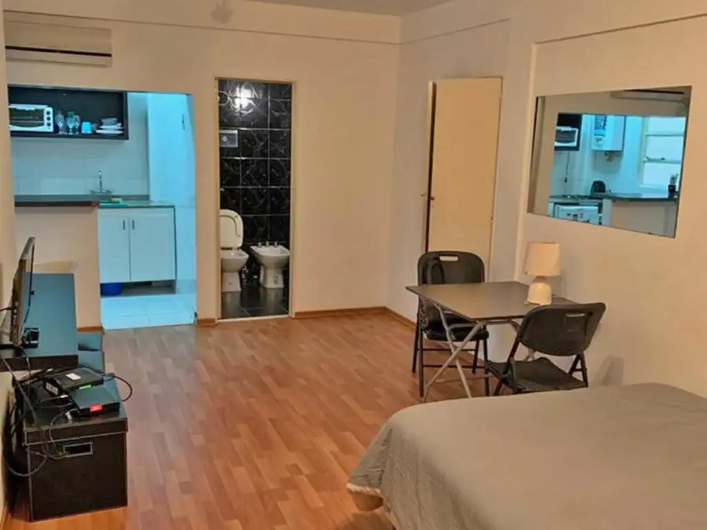 _ El mismo posee cocina eléctrica equipada con muebles sobre y bajo mesada integrada a un espacio principal mediante una barra desayunadora y un baño completo. Luminoso, cuenta con balcón francés y equipo de aire acondicionado.