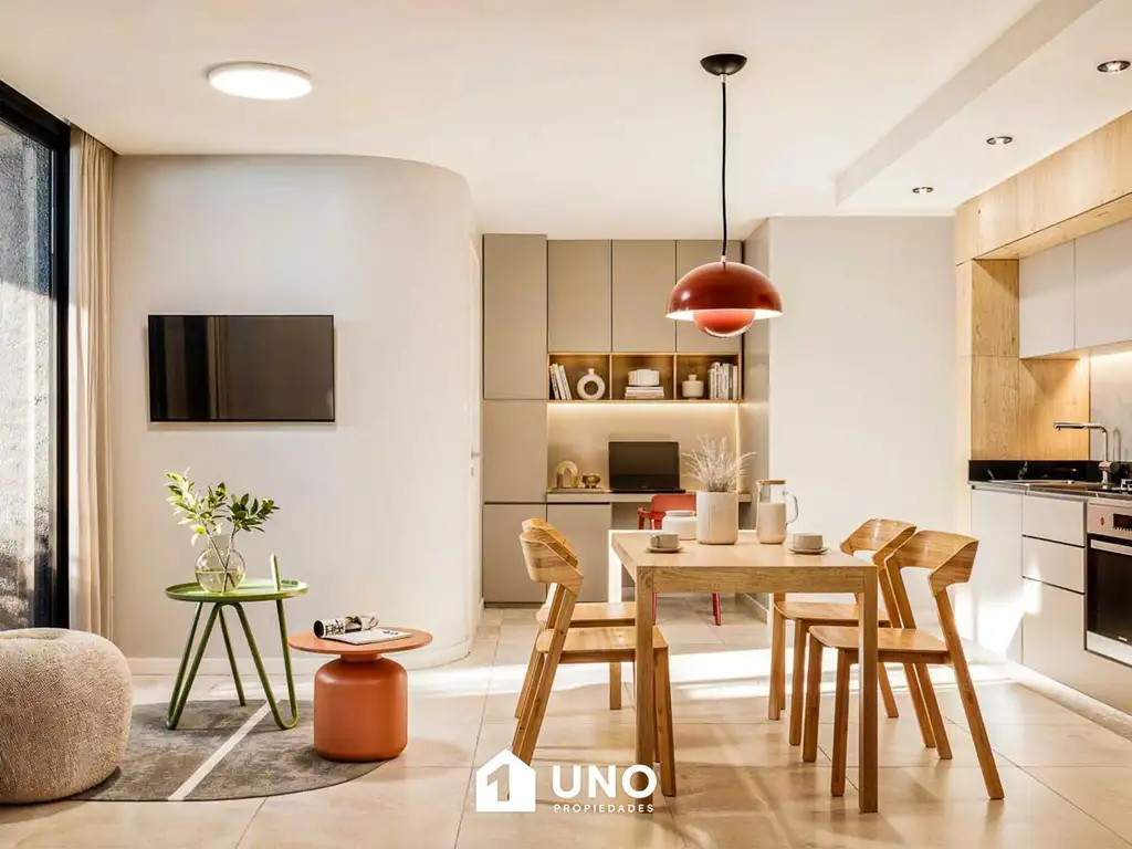 El estar/comedor, de generosas dimensiones, presenta Ventilación Cruzada y ventanales de piso a techo con salida hacia el este, directo a la terraza exclusiva, y hacia el oeste, a un segundo balcón interno. La cocina está totalmente equipada, cuenta con conexión para lavarropas y la unidad incorpora un toilette de recepción.