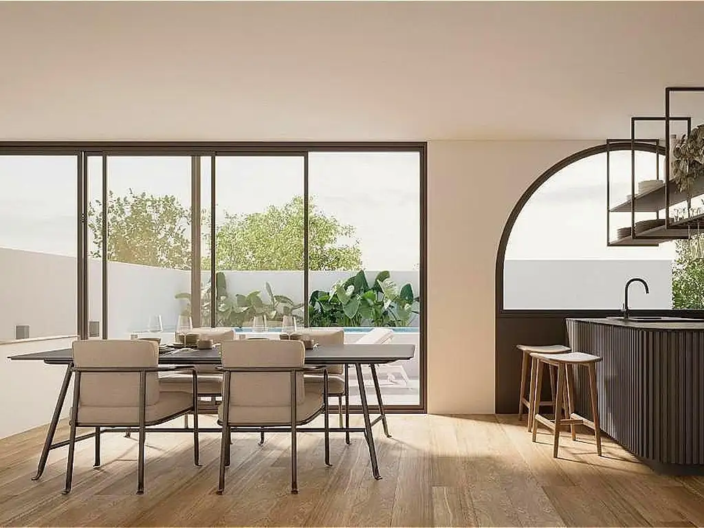Vivienda de pasillo con tres dormitorios, patio en planta baja y terraza equipada con quincho, solárium y piscina. La propiedad cuenta con una cocina con isla separada, amplio espacio de estar-comedor, patio y toilette en planta baja.