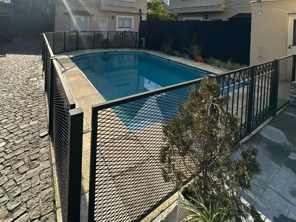 Patio descubierto que puede funcionar como garage para 2 autos. Posee parrilla a gas, pileta con mesada, mesita de madera con sillones.