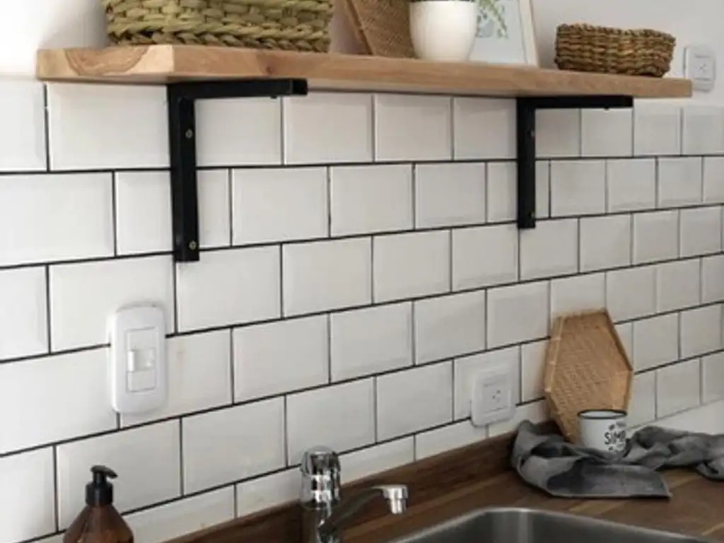 Living - comedor con pared de ladrillo, cocina integrada con muebles bajo mesada.