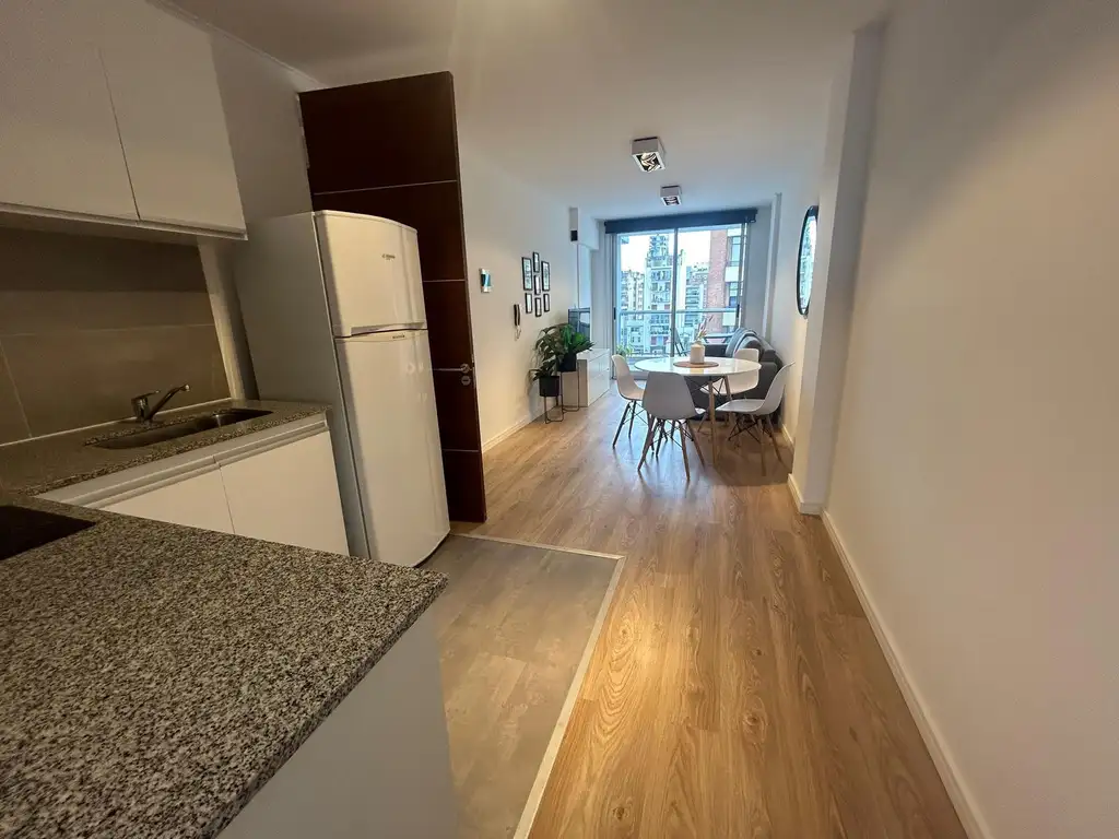Terminaciones: Pisos flotantes en comedor y dormitorios, porcelanato en cocina y balcón, mesada de granito, cocina revestida en porcelanato, anafe separado y horno empotrado, campana extractor, alacenas y bajo mesada mdf, aberturas DVH. Baño con ducha.