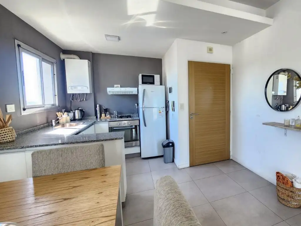 La unidad consta de dos amplios y luminosos ambientes con cocina integrada, en la cual podemos encontrar todo lo necesario para cocinar. Cuenta con pava eléctrica, platos, vasos, cubiertos, utensilios de cocina varios, seca platos, fuentes, asaderas, colador... etc. Amplia mesada en L con muebles bajo mesada y espacio para el lavarropas instalado listo para ser utilizado. Termotanque eléctrico de última generación, heladera con freezer y microondas, el horno enchapado en acero inoxidable a gas de encendido eléctrico y anafe de dos hornallas.