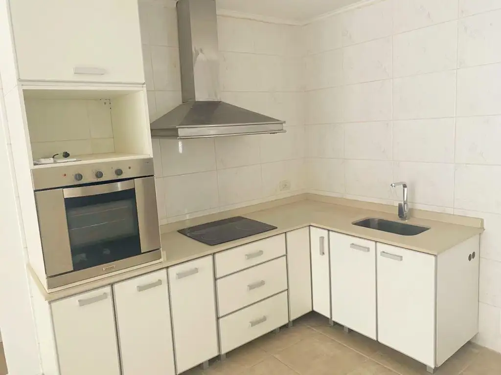 - Cocina con bajo mesada, mesada con bacha simple de acero inoxidable, con grifería mono comando. Cuenta con artefacto de cocina eléctrico marca Longvie empotrado en mueble a medida, anafe eléctrico Vitrocerámico de 4 hornallas y extractor de humo de acero inoxidable.