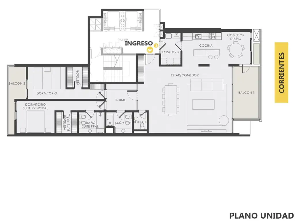 Imponente estar comedor con cocina americana y comedor diario. Amplio balcón al frente con vista al Río. El sector social lo completa un toilette de recepción y lavadero privado. En el sector íntimo: suite principal con vestidor saliendo al voladizo sobre calle Corrientes. Segunda habitación con vestidor con acceso a la expansión Este asistido por baño completo.