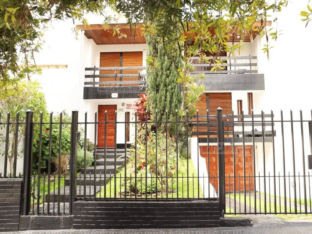 CHALET CON JARDIN AL FRENTE Y FONDO LIBRE, LUGAR P/PILETA, QUINCHO, PARRILLA, GARAJE CUBIERTO PARA 2 VEHICULOS MAS OTRO VEHICULO EN COCHERA DEL JARDIN, RECEPCIÓN, LIVING COMEDOR, HALL, BAÑO TOILETTE COMPLETO, COCINA Y COMEDOR DIARIOS, LAVADERO, FONDO JARDIN, EN ALTOS 3 DORMTIROIOS CON PLACARD, BAÑO COMPLETO Y DORMITORIO EN SUIT CON BAÑO Y VESTIDOR. BALCONES AL FRENE Y CONTRAFRENTE.- EDIFICADO SOBRE LOTE DE 8,66X30,50 M.