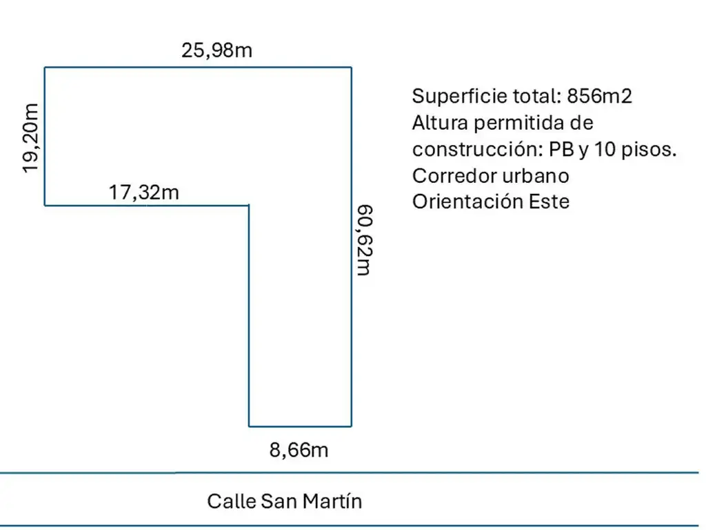 Medidas: 8,66 x 44,42 60,62 x 25,98 totalizando una superficie de 856m2.