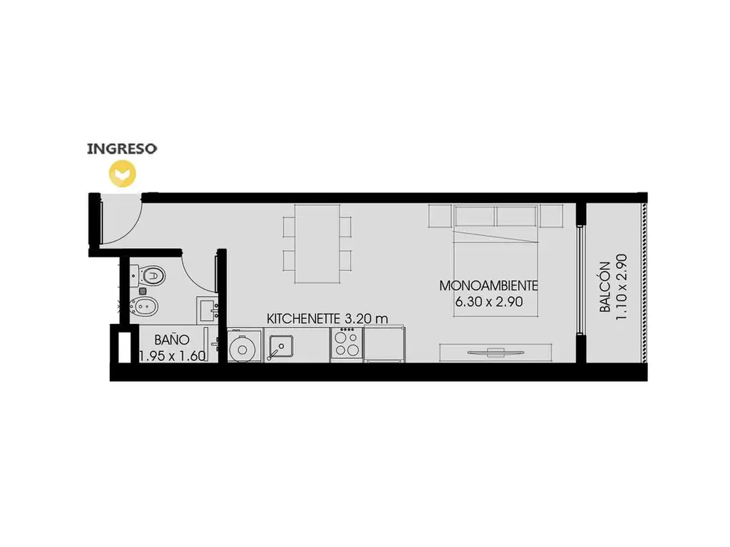 Amplio loft divisible con cocina integrada y salida a balcón al Norte. Baño completo.