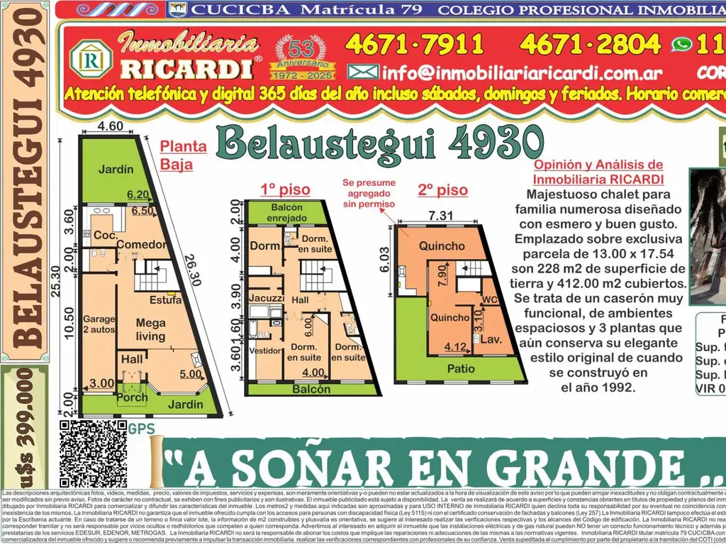 La Inmobiliaria RICARDI NO garantiza que el inmueble cumpla con el certificado de conservación de fachadas y balcones (Ley 257) tampoco efectúa el estudio de títulos, ni analiza los alcances del Código de edificación y no será responsable por los vicios ocultos o redhibitorios que competen a quien corresponda. Advertimos al adquirente que las instalaciones eléctricas, de gas natural y-o sanitarias pueden NO solo no tener un correcto y adecuado funcionamiento técnico sino que además puede NO cumplir con las exigencias actuales de METROGAS- EDESUR- EDENOR - siendo a cargo del adquirente que implique su puesta en valor y-o funcionamiento.