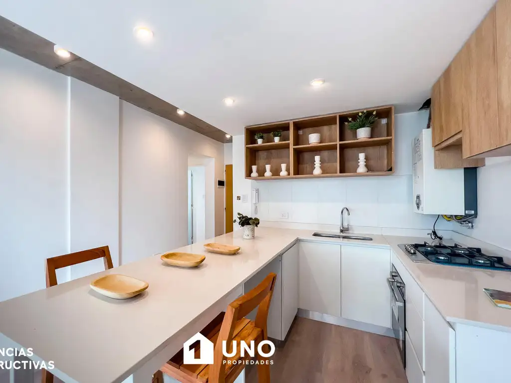 Compuesto por el estar/comedor con cocina integrada completamente amoblada, isla con anafe y bacha, salida al balcón terraza al frente que dispone de parrillero y un baño completo. Lavadero separado, con mesada y bacha. 2 dormitorios con vestidor, uno de ellos con baño en suite y ambos con salida al balcón terraza.