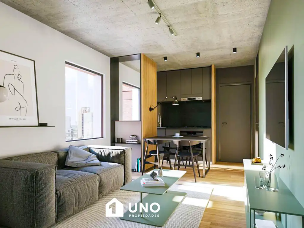 Compuesto por el estar/comedor con cocina integrada, completamente amoblada y salida al balcón hacia el aire luz. Baño completo y un dormitorio con placard y salida al balcón.