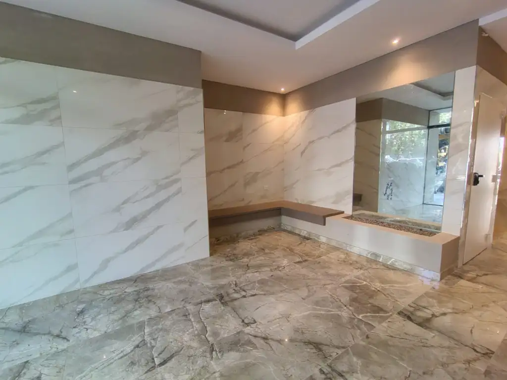 Edificio con hall de entrada de blindex, espejos y asientos para recepción, solarium y parrillas en el último piso.