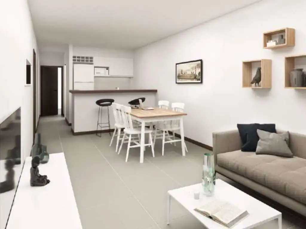 Muebles de cocina completos: bajo mesada, alacenas, porta microondas, bodeguero en melamina blanca, mesada en granito gris mara, pileta de acero inoxidable Johnson y gritería monocomando FV o similar. Espacio y conexiones para lavarropa.