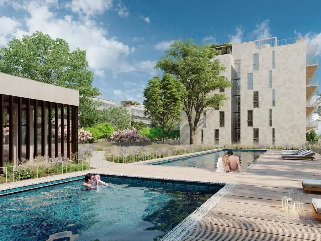 Los edificios de departamentos se encuentran insertos en un frondoso parque de 20.000 m2 de superficie, acompañado con sector de juegos para niños, plaza seca y SUM.