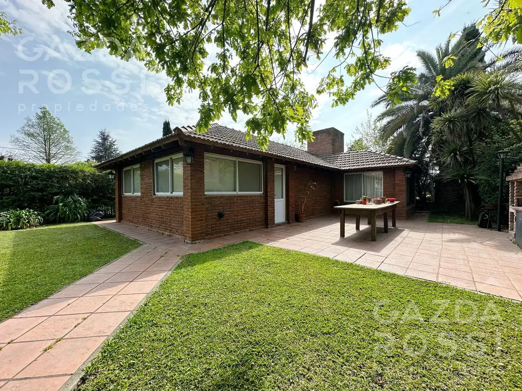 Exterior: Cochera cubierta para 2 autos, gran patio con parrilla, piscina de 9x5, gran parque verde con vegetacion añosa.