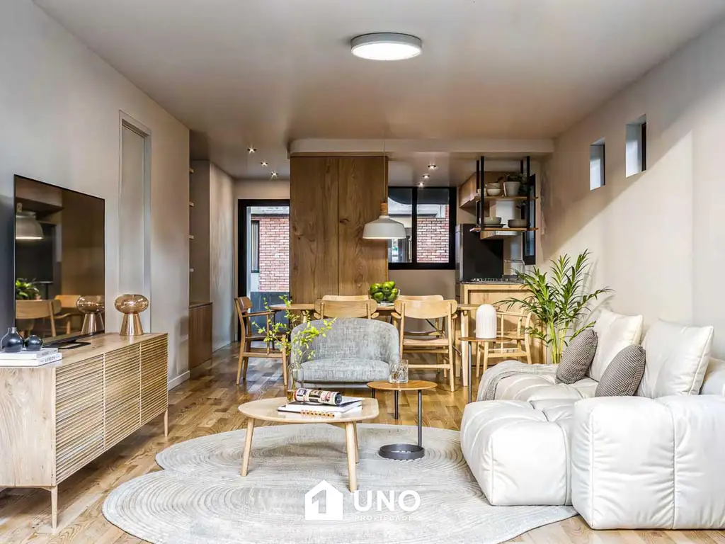 Cuenta con un amplio estar/comedor con Ventilación Cruzada y ventanal de piso a techo con salida directa al patio. La cocina es semiseparada, totalmente equipada, y la unidad incorpora un baño de recepción.