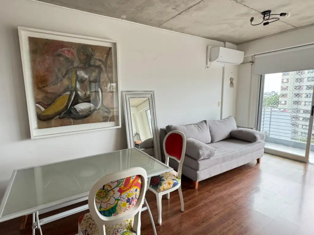 El departamento posee living comedor con placard, cocina semi independiente con muebles altos y bajos, lavadero incorporado, baño completo, hermoso balcon corrido de 8 m2 al contra frente con dos amplios ventanales lo que otorgan muchísima luz y aire natural a la unidad Sus pisos son flotantes, se encuentra instalado aire frío/ calor.