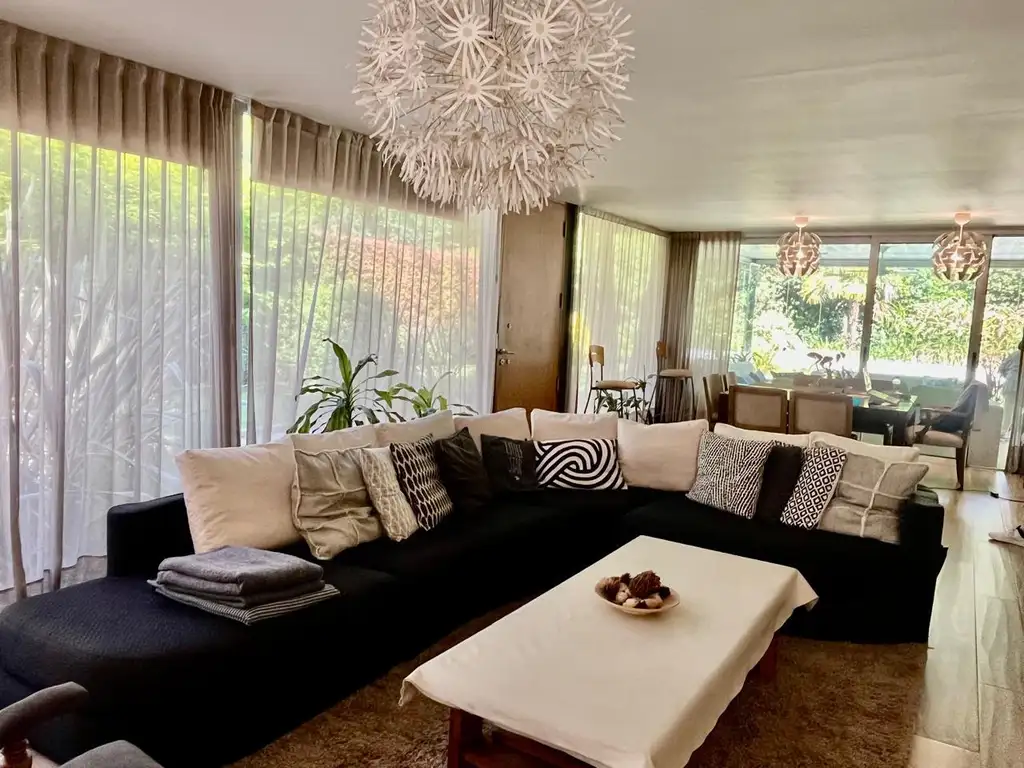 Amplio living comedor con grandes aberturas que integran el interior con el jardín.
