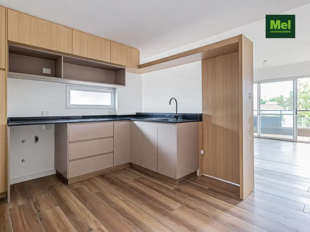 Moderno monoambiente con cocina integrada y barra desayunadora, baño completo y balcón al contrafrente.