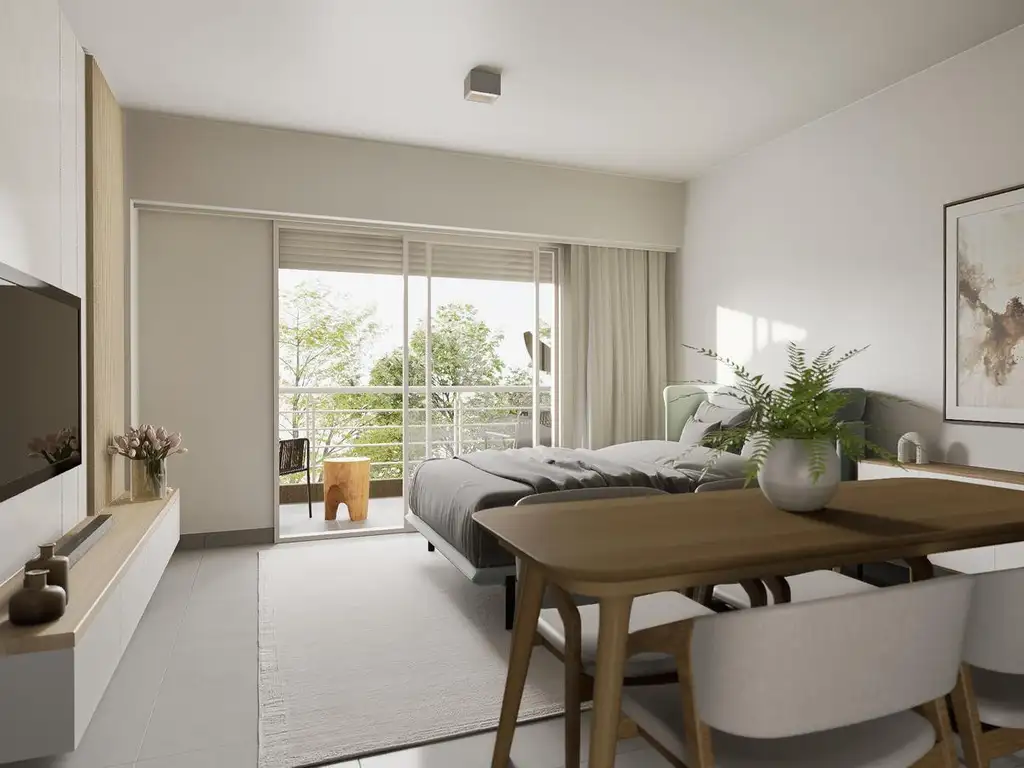 Se ingresa por cocina integrada al ambiente con muebles bajo mesada y alacena, mesada de granito gris mara (o similar) con bacha de acero inoxidable y grifería monocomando. Salida a balcón. Baño completo.