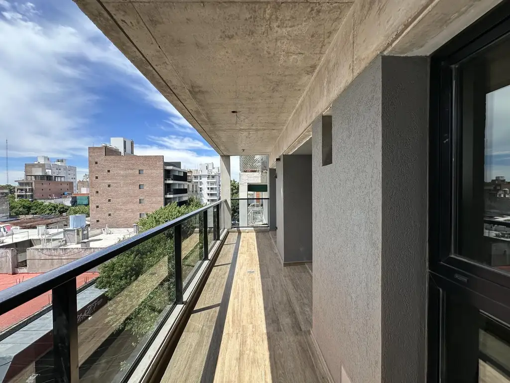 Departamento con piso flotante y porcelanato, cocina amueblada y equipada, amplio living/comedor y baño con griferías FV y sanitarios línea premium. Incluye placard con interiores, puerta blindada, y un balcón amplio con aberturas línea Modena DVH A30, ofreciendo mayor aislamiento y confort.