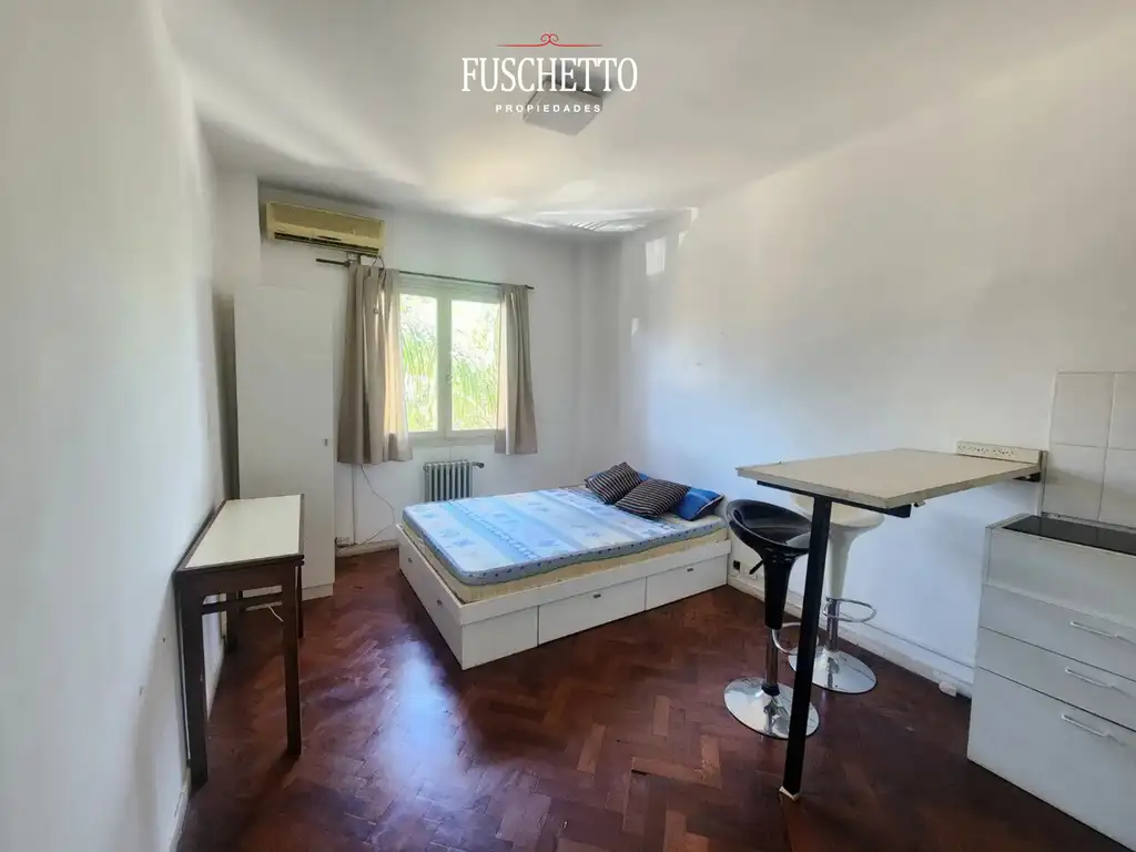 Hall de ingreso. Ambiente integrado con placard, split, cama de 2 plazas con cajoneras, barra desayunadora con 2 banquetas, kitchenette con heladera, anafe vitrocerámico. Baño con bañera.