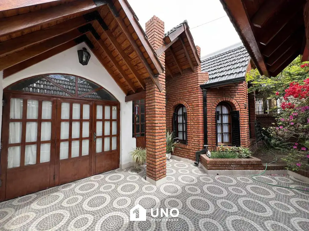 Hermosa casa al frente de dos dormitorios (uno amplio con entrepiso), amplio living comedor, cocina y comedor diario con vista al parque, parque con piscina, amplio quincho con parrillero, cocina y baño. Cochera doble (una cerrada y otra abierta) y porton electrico.