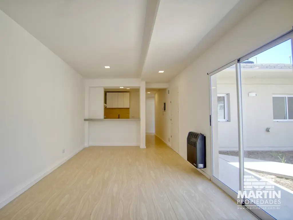 Living comedor, cocina con muebles completos, dos cómodos dormitorios, baño completo y jardín de 7x6.