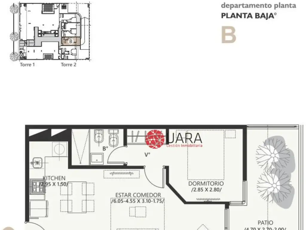 DEPARTAMENTO EN VENTA: Torre 2 Planta Baja "B" se accede a estar comedor con cocina integrada con muebles bajo mesada, dormitorio con placard, baño completo y patio propio.