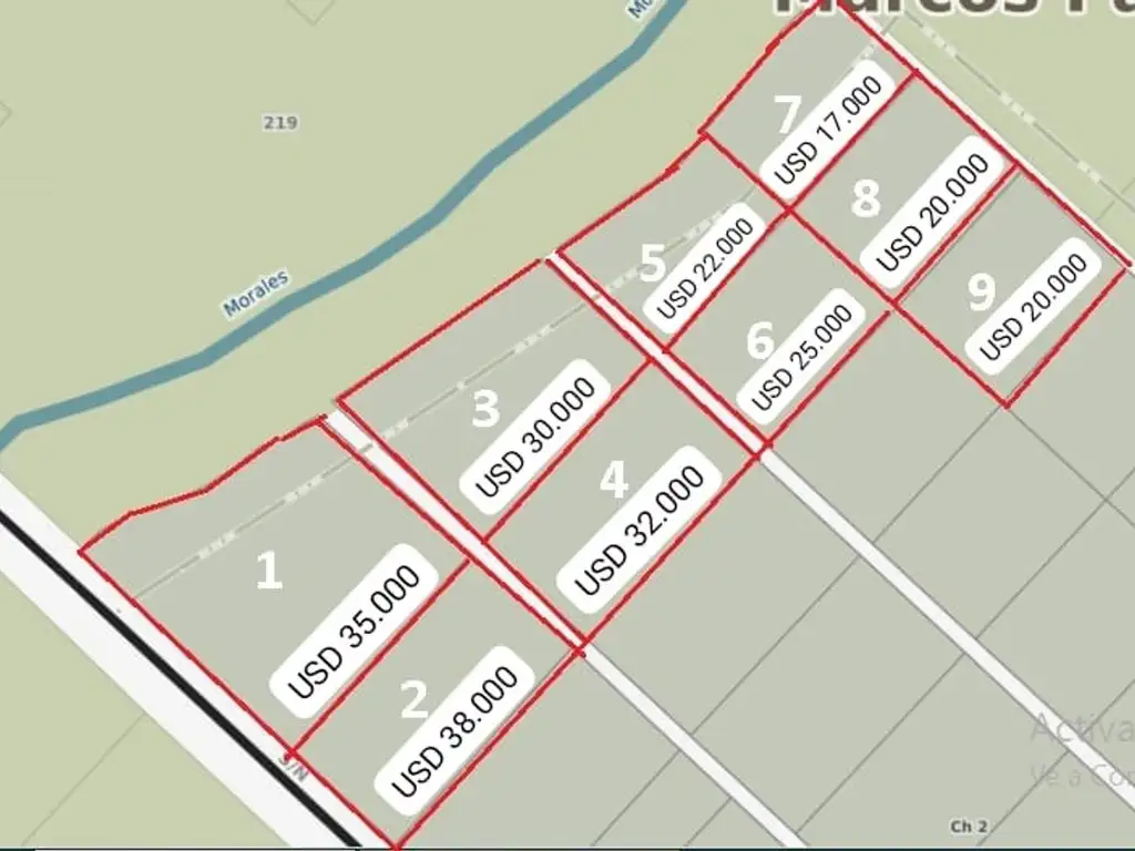 Parcela N° 9, sobre calle interna, posee forma irregular con un frente de 184.23m. x 234.26m. de fondo, superficie aproximada de 4.3 hectáreas. Valor por hectárea USD 20.000.-